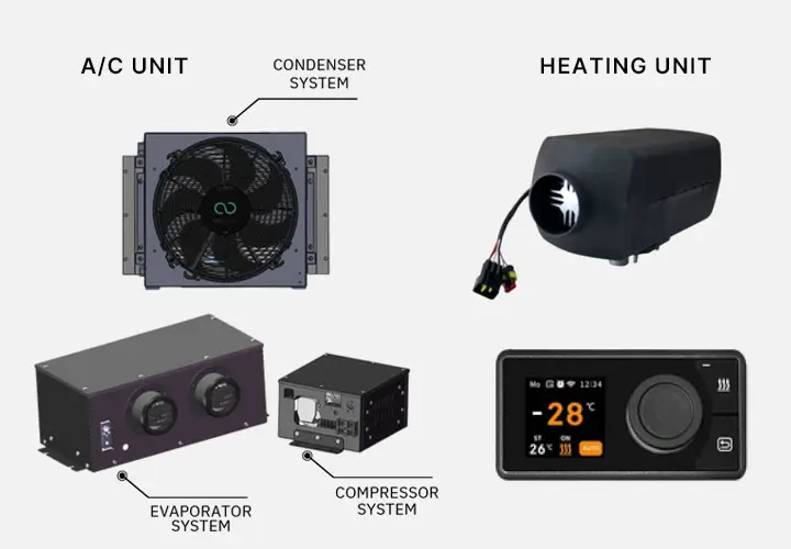 A compact heating and cooling unit installed inside the cab/sleeper. It handles all climate control without requiring any under-chassis equipment.